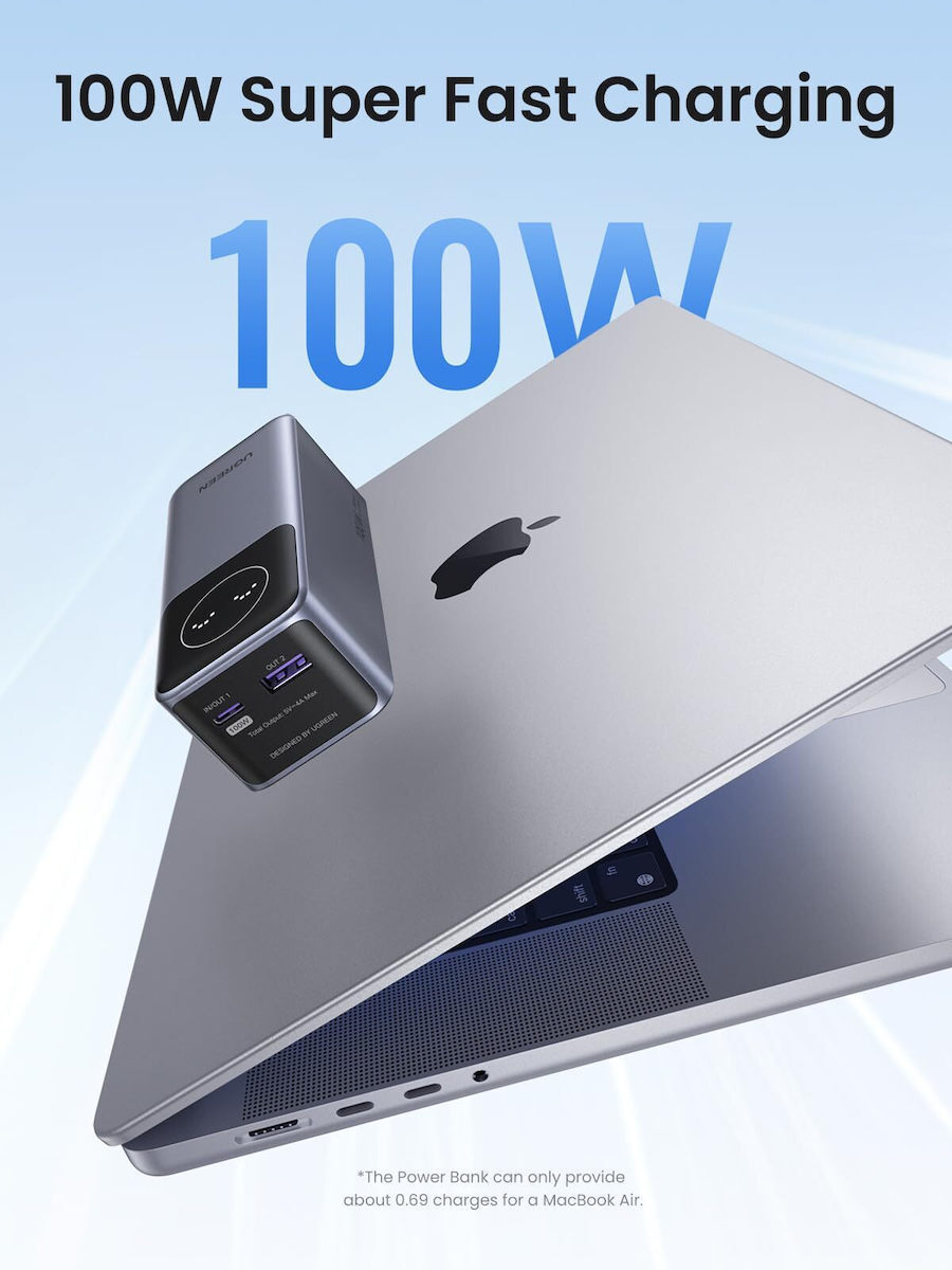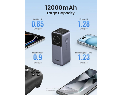 Bateria externa Ugreen PB724 alimenteaza in mod convenabil toate dispozitivele esentiale de oriunde te-ai afla, datorita capacitatii bateriei de 12.000 mAh. Incarcati un MacBook Pro 16" pana la 43% in 30 de minute. Functioneaza cu MacBook Pro/Air, iPad Pro/Air, seria iPhone 15, Galaxy S24/S23 Ultra, Switch, Steam Deck si multe altele.