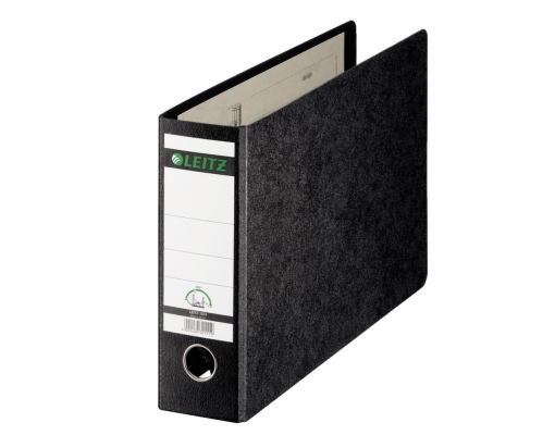 Biblioraft fabricat din carton rigid si rezistent. Mecanism Leitz 180°, cu deschidere mai mare cu 50% fata de mecanismul obisnuit, pentru o arhivare cu 20% mai rapida. Eticheta autoadeziva pe cotor, pentru identificarea rapida a continutului. Garantie 5 ani pentru mecanism. Format: A4 landscape. Diametru inel: 80 mm (500 coli). Culoare: negru.