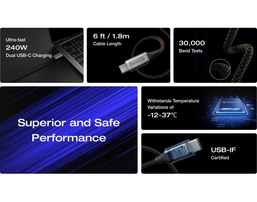 Acest cablu dual USB-C ofera o putere de pana la 240 W, suportand incarcarea rapida pentru 99% dintre dispozitivele USB-C - laptopuri, smartphone-uri, baterii externe, camere foto, console portabile si multe altele. Un cip E-mark incorporat asigura o livrare inteligenta a energiei si o incarcare sigura de fiecare data.