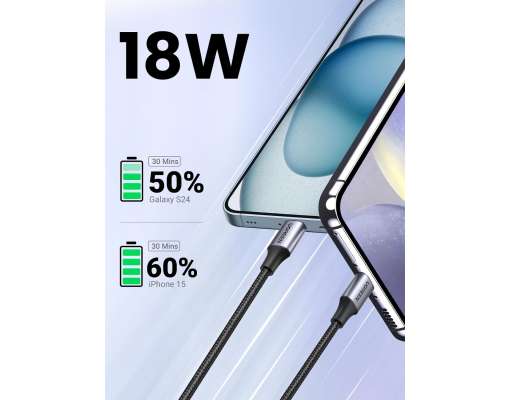 Cablu Ugreen USB-C la USB-A 18W ofera incarcare rapida FCP si QC 3.0 si este compatibil cu iPhone 15/15 Plus/15 Pro, Galaxy S24/S23/S22 Ultra, iPad Pro 2021/2020/Tab S8, Note 11/10 , Pixel 8/7, Switch, Hero 9 etc.