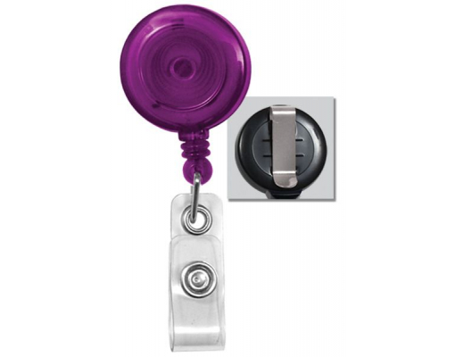 Clips cu snur retractabil, transparent, fara sticker, cu posibilitate de personalizare. Sistem de agatare metalic, bareta din vinil. Diametrul: 32 mm. Lungimea firului: 864 mm. Culoare: mov.