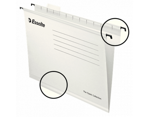 Dosare suspendabile confetionate din carton kraft 100% reciclat (210 g/mp), acum de 10 ori mai puternic, datorita bazei ranforsate cu o banda speciala si carligele de sustinere intarite. Sunt prevazute cu suport de eticheta fabricat din plastic transparent si etichete de hartie, albe. Format A4 si o greutate de 0,06 kg. Dimensiuni: 345 x 240 x 0 mm.