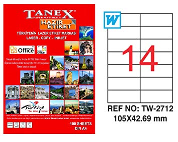 Dimensiuni eticheta: 105 x 42.69mm. Etichete/A4: 14. Ambalare: 100 coli/top. Recomandate pt.: 1: plicuri; 2: identificare produse. Alte detalii: 1: fara margini; 2: colturi drepte; 3: pt. imprimante laser, inkjet sau copiatoare.