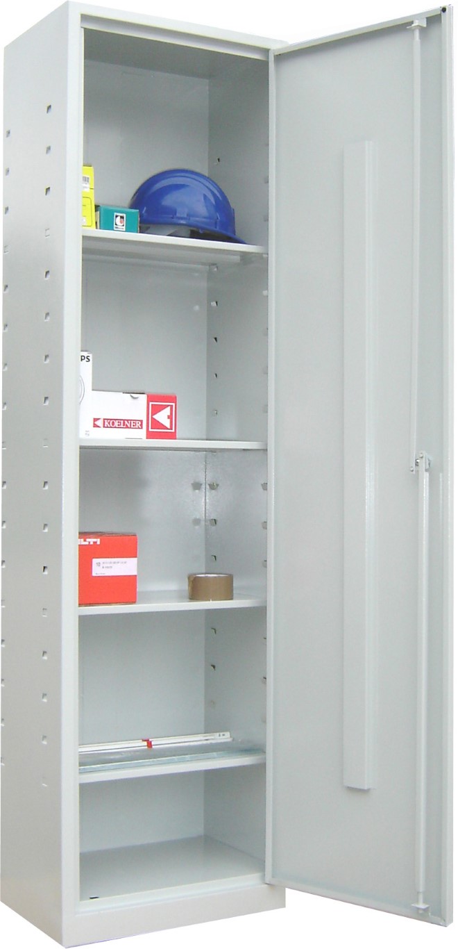 Caracteristici tehnice: - dimensiuni de gabarit: 500x350x1800 mm, LxlxH - executie integral din tabla calitatea DC 01 cf EN 10130 - corpul asamblat prin sudura - 1 usa, prevazuta cu profil de rigidizare sudat pe interior - sistemul de incuiere este tip yala cu 2 chei si blocare in 2 puncte: sus, jos - balamalele usilor nu sunt vizibile - usile sunt prevazute cu amortizoare de cauciuc pentru o inchidere silentioasa - la interior se gasesc 4 polite reglabile pe inaltime la un pas de 80 mm, politele au profil de rigidizare sudat sub ele - greutate max/polita: 70 kg - la baza, dulapul este prevazut cu soclu cu inaltimea de 80 mm - sub soclu sunt prevazute picioruse H 10 mm din tabla zincata si vopsita pentru o asezare corecta si a evita coroziunea - vopsire in camp electrostatic culoare gri deschis RAL 7035 txt
