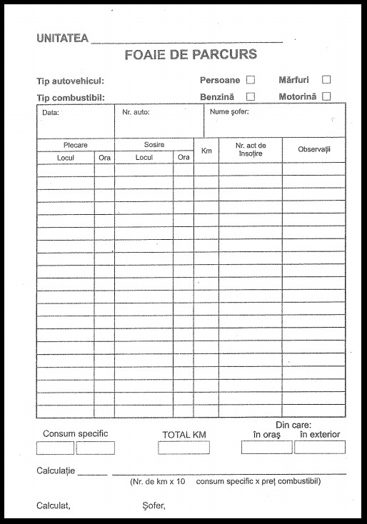 Marketing Concept va pune la dispozitie Foaie de parcurs marfa/persoane , format A5, 100 file/carnet, offset, tipar FATA Carnetele sunt capsate pentru o siguranta sporita,acestea fiind prevazute cu perfor la cotor pentru o rupere mai usoara. Hartia este de o calitate superioara. Tabelurile sunt construite pe baza legislatiei conform cerintelor