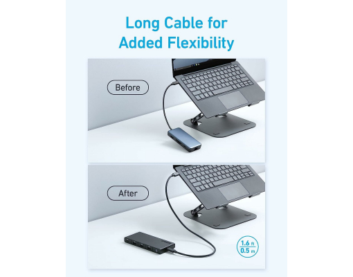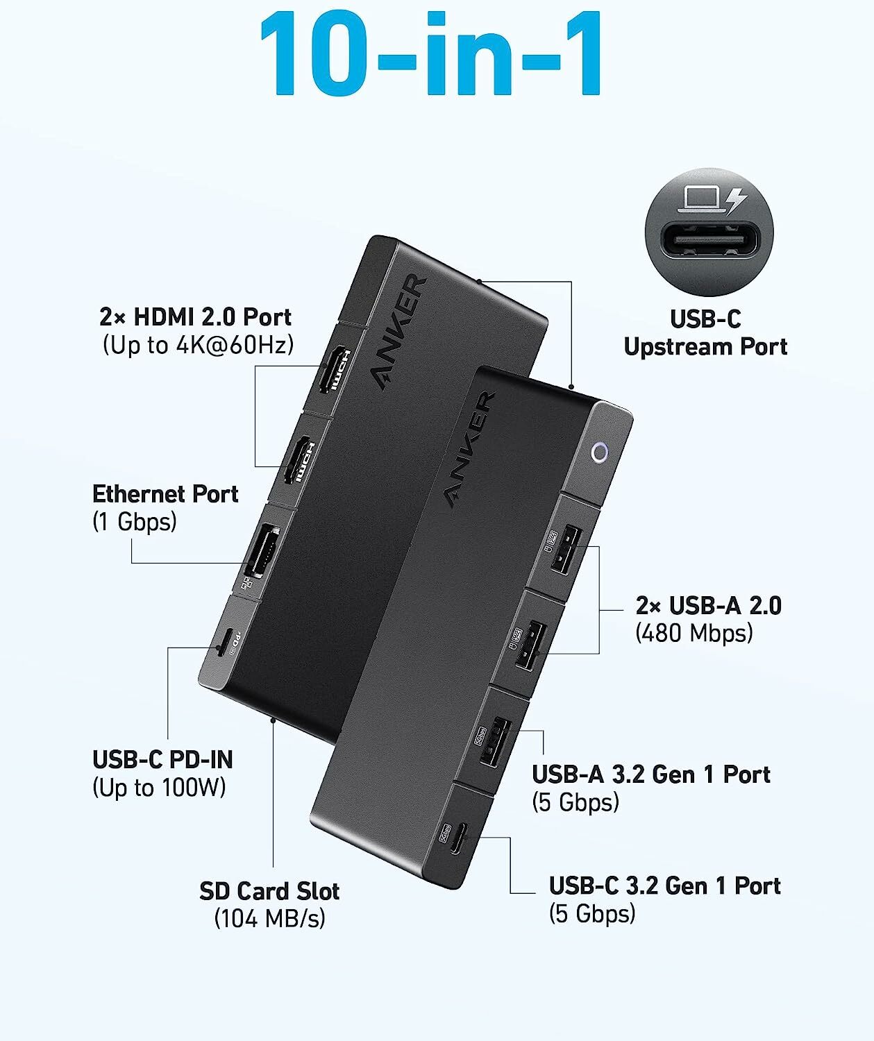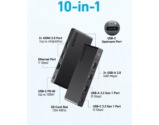 Hub Anker 364 10-in-1, 100W Power Delivery, USB-C Dual 4K HDMI, 1 Gbps Ethernet, 4x USB-A, port card SD, Negru