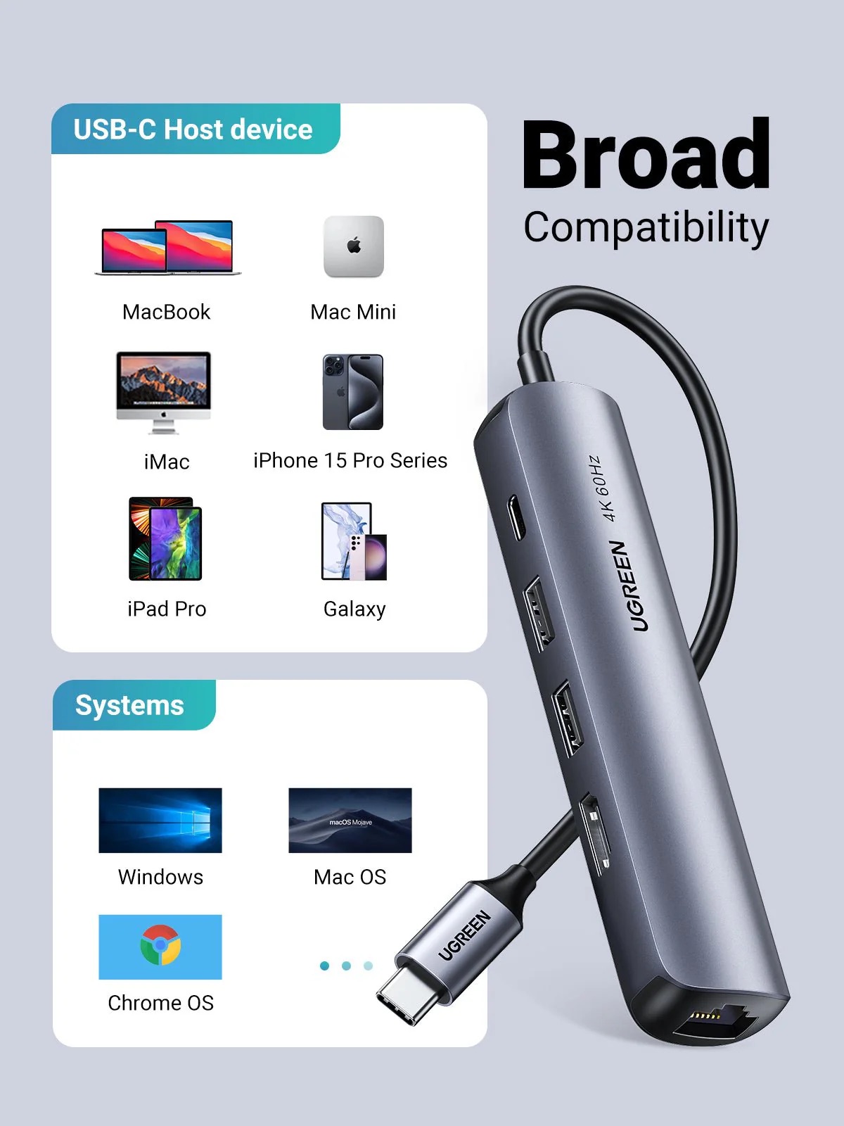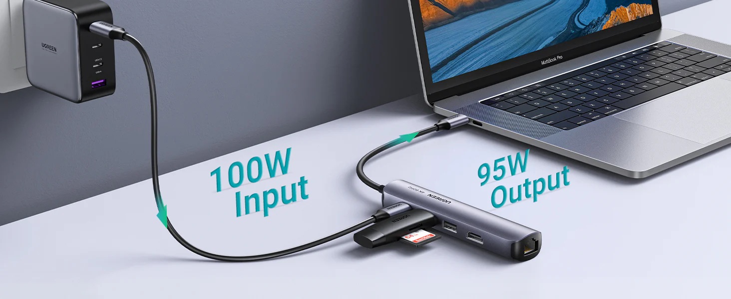 Atunci cand utilizati toate functiile dongle-ului USB-C, portul de incarcare USB-C PD 100W poate incarca complet dispozitivul dumneavoastra. Este compatibil cu MacBook Pro 2016/2017/2018/2019, MacBook Air 2018/2019/2020, Surface GO, Google PixelBook si altele. (Nota: Portul USB-C suporta doar incarcarea si nu suporta transmisia de date)