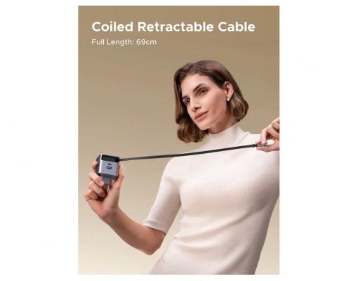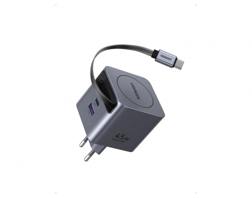Incarcator de retea UGREEN 45W, GaN Fast Charger, USB-C, USB-A, Cablu Retractabil incorporat, Gri
