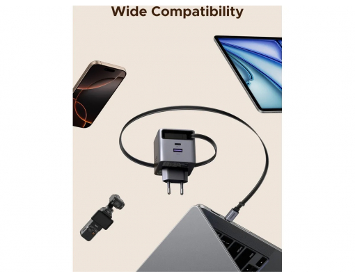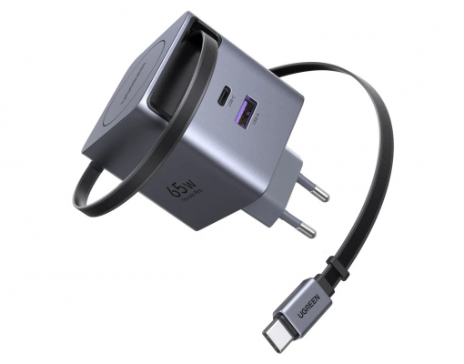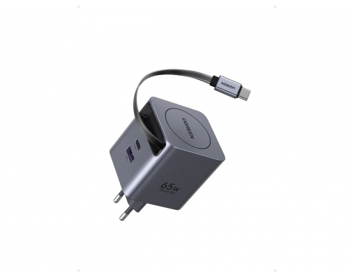 Incarcator de retea UGREEN 65W, GaN Fast Charger, USB-A, USB-C, Cablu Retractabil incorporat, Gri