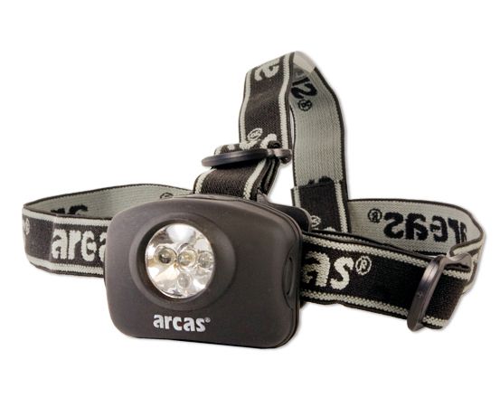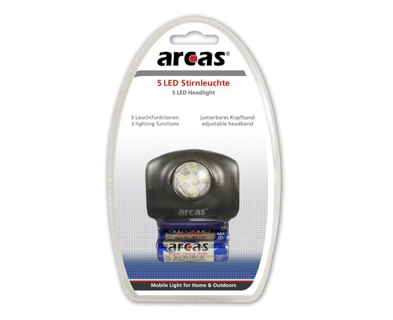 Lanterna pentru cap, Arcas, cu 5 LED-uri. Caracteristici principale: carcasă din plastic, curea reglabilă pentru cap, 5 LED-uri super-luminoase, până la 100 000 de ore de viață a LED-urilor, ideal pentru muncă, drumeții, jogging, alimentat de 3 x R03 (incl.), 3 funcții de lumină: