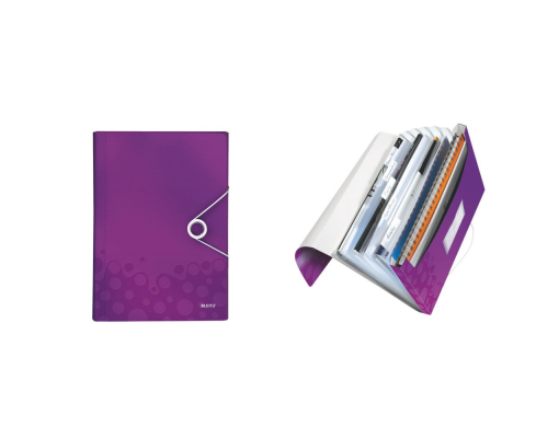 Mapa din Polipropilena (PP) de inalta calitate, in design modern WOW, cu efect dual color. Este ideala pentru organizarea documentelor, proiectelor, prezentarilor etc. Capacitate mare si inchidere sigura cu elastic. 6 compartimente extensibile cu index, pentru identificarea rapida a continutului. Un compartiment frontal fix, pentru stocarea diverselor documente, accesorii sau a caietului de notite. Inchidere cu banda elastica, pentru transportul in siguranta al documentelor. Se completeaza perfect cu celelalte produse din gama Leitz WOW. Capacitate: 250 coli A4 (80 gr/mp). Dimensiuni: 254 x 38 x 330 mm. Culoare: mov.