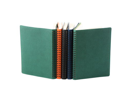 Coperta flexibila din piele ecologica dubla fata, colt rotund, cusutura perimetrala, prinsa de bloc cu spira semiascunsa. Bloc fix autodatat, format 16x22 cm, hartie offset ivory, nr. pagini 224, tipar 2 culori.