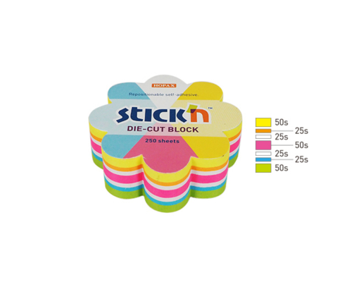 Notes autoadeziv Die-Cut - floare, 67 x 67 mm, 250 file/set, Stick"n - 5 culori fluorescente