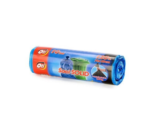 Sacii menajeri OTI SOLID de 120L, 70x110 cm, sunt potriviti pentru o EUROPUBELA MICA de gunoi. Au o rezistenta crescuta datorita materialului, ce poate sustine o incarcatura de pana la 20 KG si sunt perfect etansi, ideal de folosit in bucatarie sau restaurant. Se desprind perfect fiind pretaiati. Rola contine 10 bucati.