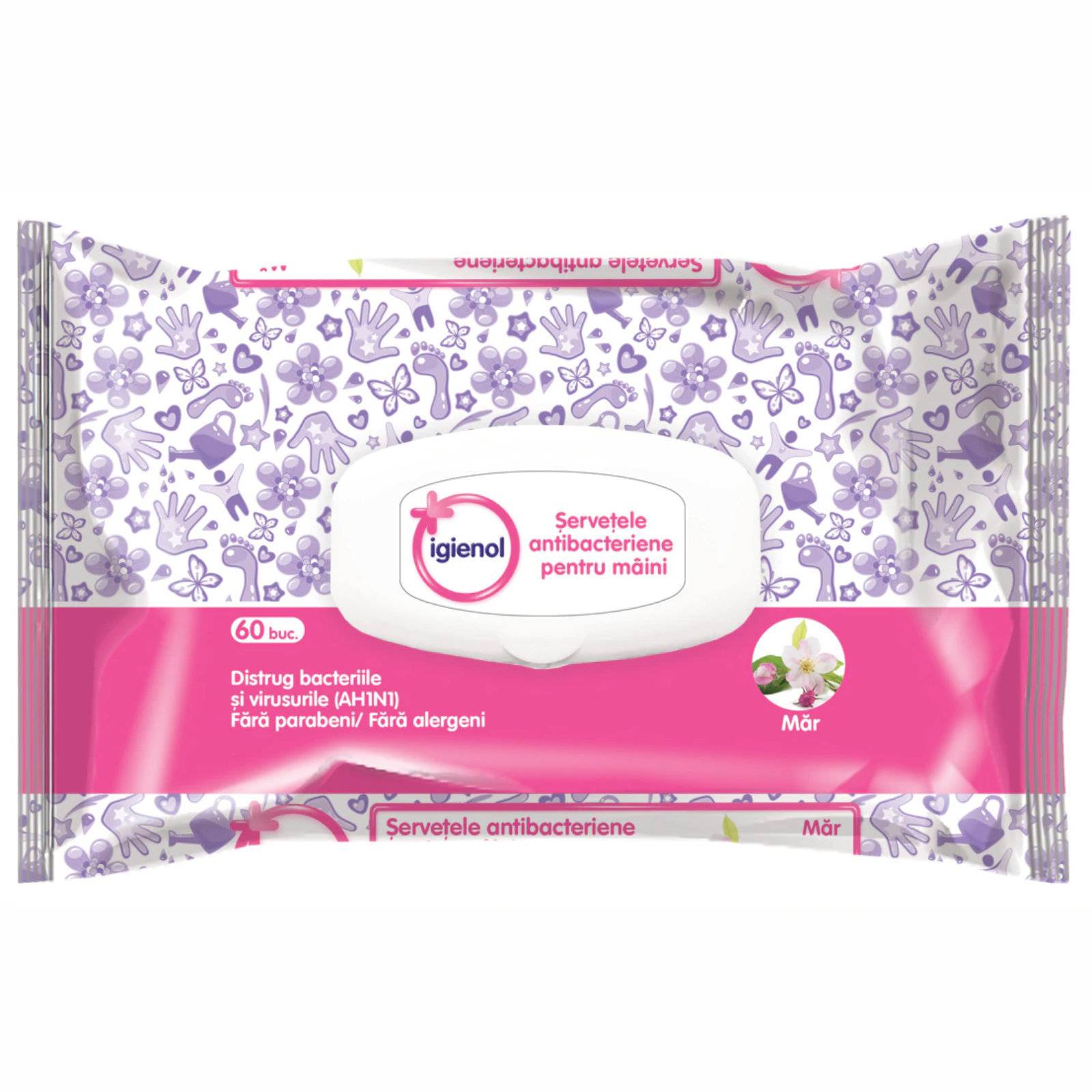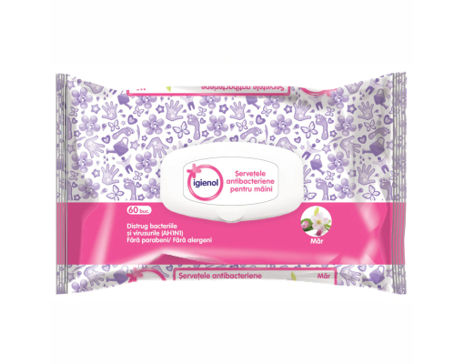 Servetele antibacteriene pentru maini, testate dermatologic, fara parabeni, fara alergeni Beneficii: Igienol servetele antibacteriene distrug 99.9% din bacterii (Staphylococcus aureus, Pseudomonas aeruginosa, Escherichia coli, Enterococcus hirae), virusuri (AH1N1, AH3N2). Servetelele Igienol curata, hidrateaza si igienizeaza pielea. Testate dermatologic. Sunt usor de folosit oriunde, oricand.