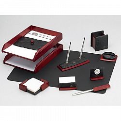 Compus din 10 piese: mapa birou (50x40 cm), suport stand 2 pixuri, suport notes, suport carti vizita, cutit corespondenta, suport instrumente de scris, tavita dubla pentru documente, ceas, capsator, suport calendar