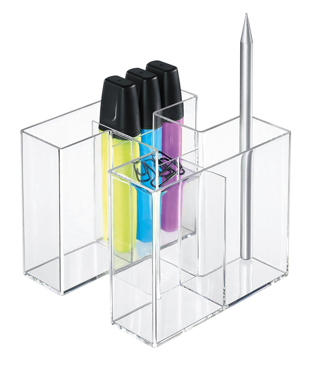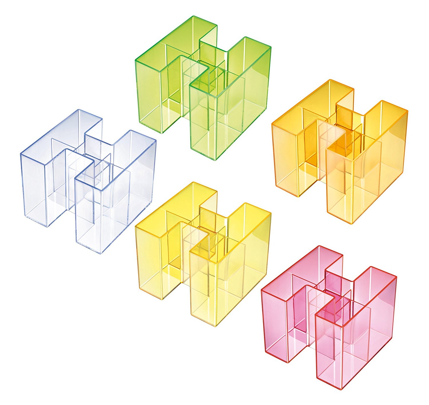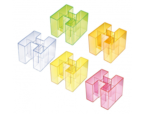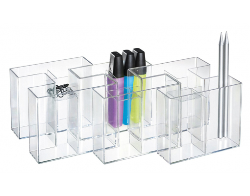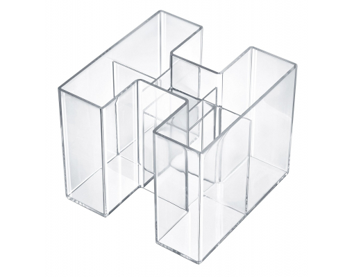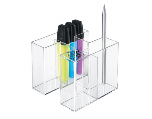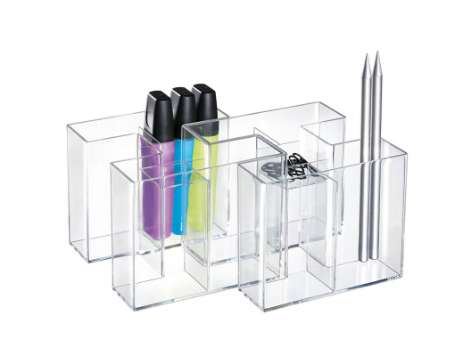 Un suport atractiv, durabil si distinctiv. 4 compartimente care asigura suportul pentru instrumente de scris si markere. Compartimentul mai mic din mijloc este ideal pentru radiere si agrafe. Datorita design-ului inovativ, suportul Bravo poate fi extins: ori ca un singur suport sau ca pereche de trei suporti. Confectionat din material plastic de calitate superioara, fara metale grele. Dimensiuni: 109 x 90 x 109 mm. Culoare: transparent cristal.